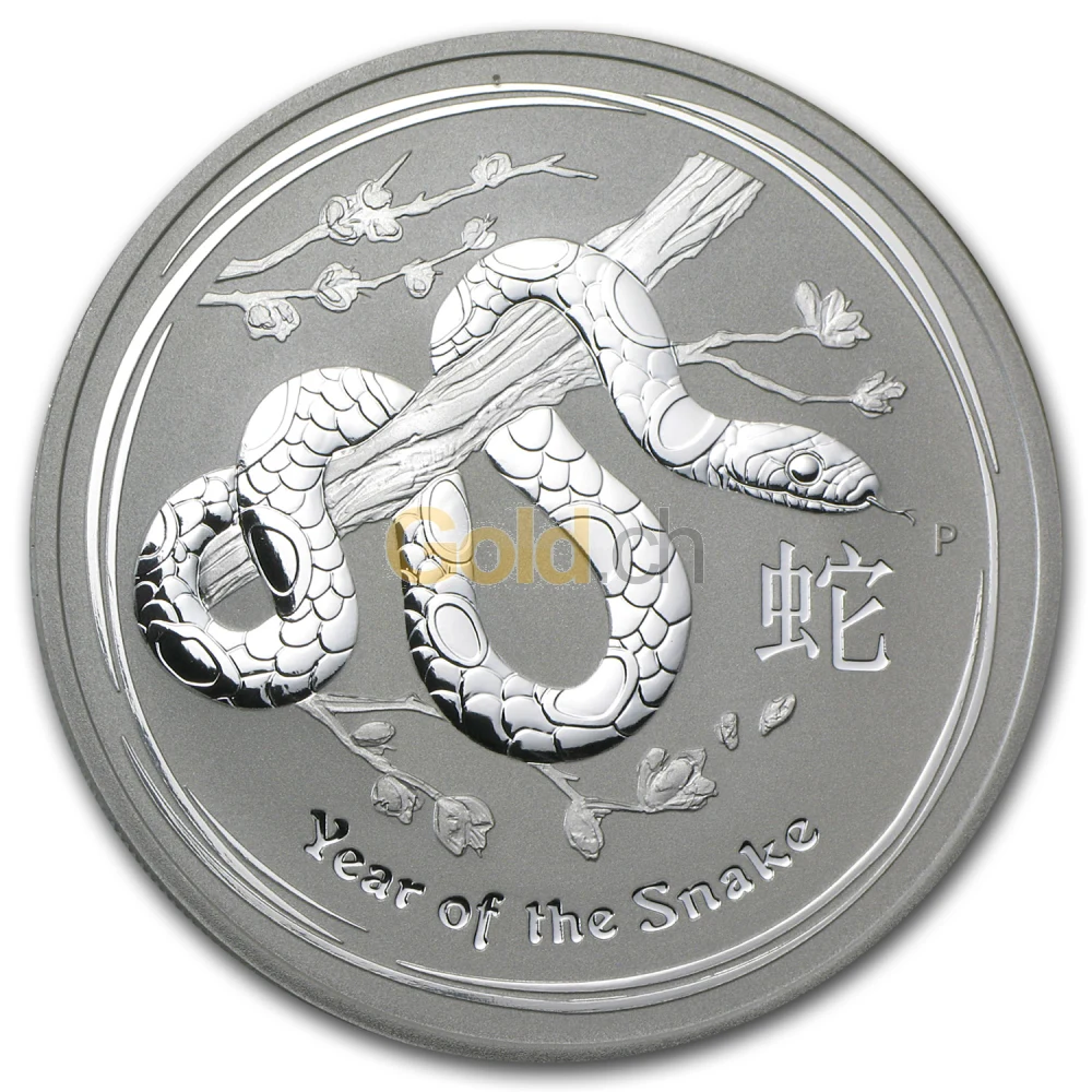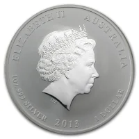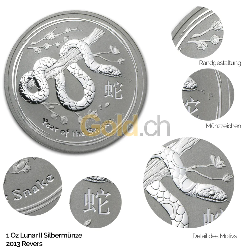 Da Schlangen eher Einzelgänger sind, befindet sich auf dem Münzrevers des Jahres 2013 auch nur ein einzelnes Reptil. Es hat seinen langen, schuppigen Körper um einen Ast geschlungen und züngelt einem unsichtbaren Angreifer entgegen. Zarte Knospen umspielen seine fein gezeichneten Hornschuppen. Die für diese Münzserie charakteristische Jahrgangsbeschriftung "Year of the Snake" folgt dem unteren Münzrand. In Verlängerung der Zunge ist das Münzzeichen P positioniert und davon links versetzt das Han-Wort für Schlange (shé = schlau).
