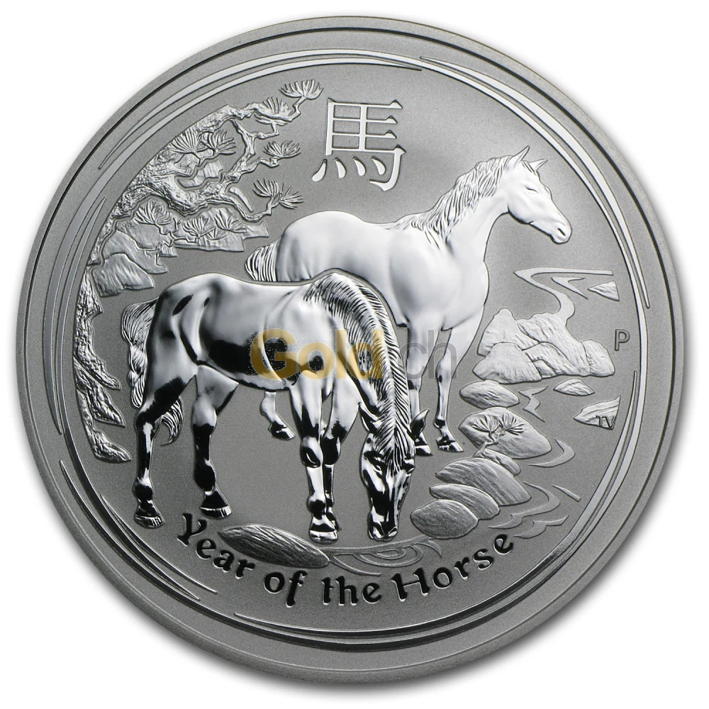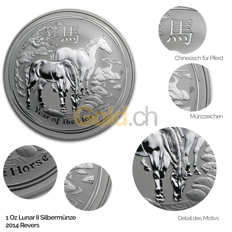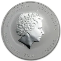 Nicht nur Pferdefreunde spricht das mit vielen Details aufwendig designte Rückseitenmotiv aus 2014 an. Zwei edle Pferde stehen am Flussufer, dessen Wasser deutlich an den sich bildenden Kringeln erkennbar ist. Das Tier im Vordergrund hat seinen Kopf zum Trinken gesenkt, während das hintere aufpasst. Steine, Gräser und Bäume stilisieren den Lebensraum der Pferde. Den Uferstein am rechten Motivrand zieren die Initialen des Künstlers Thomas Vaughan (TV). Unmittelbar darüber befindet sich das P-Zeichen der Perth Mint. Trotz der vielen Details beleibt die Abbildung übersichtlich. So fügt sich die Jahrgangsbeschriftung "Year of the Horse" harmonisch in die Gestaltung ein. Ebenso wie das chinesische Schriftzeichen für Pferd am Münzkopf (mă = Ungeduld).