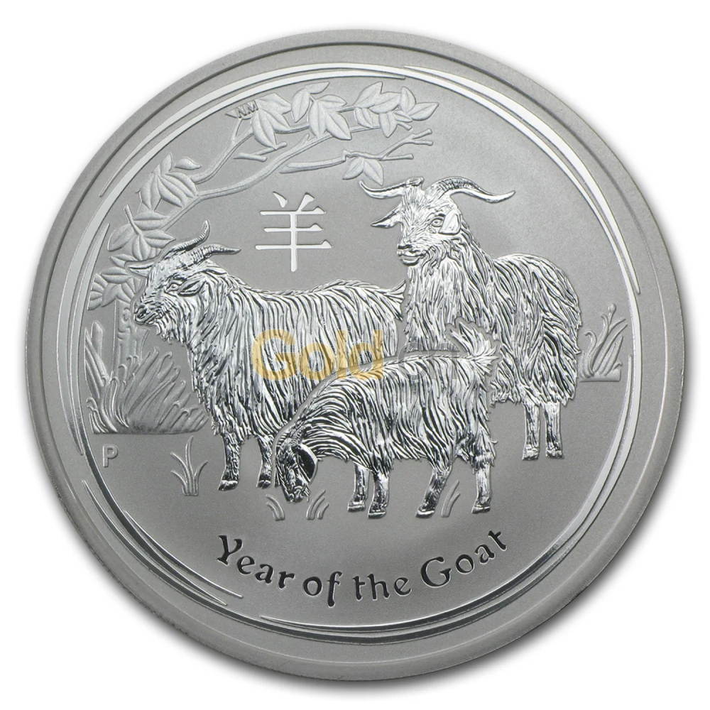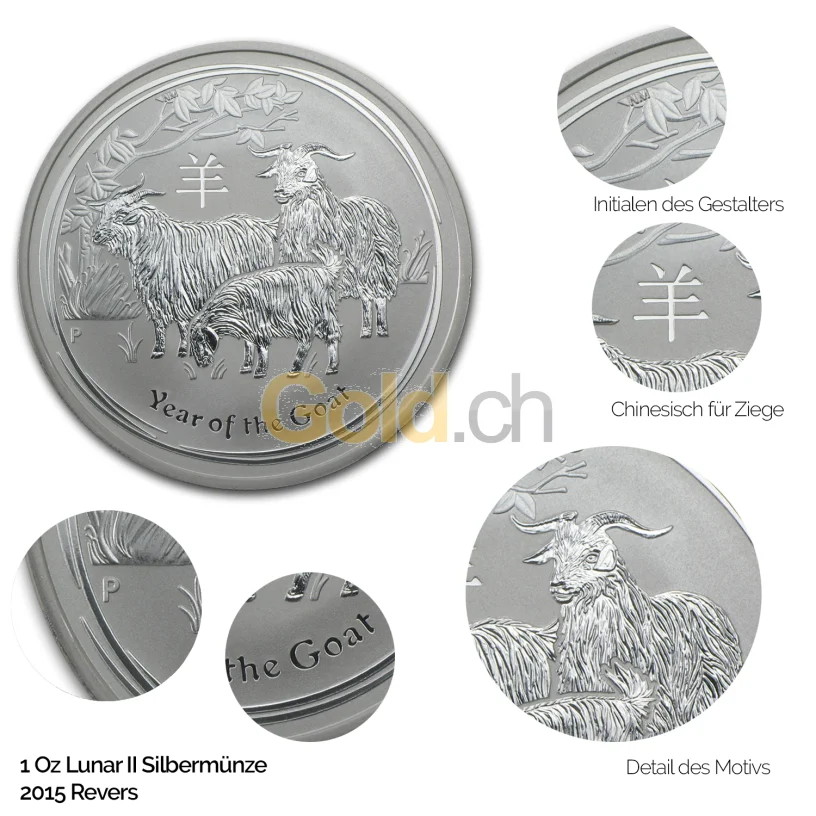 Der Revers des Jahres 2015 hat das Tierkreiszeichen Ziege zum Thema. Die Münzdesignerin Natascha Muhl stellt gleich eine Gruppe von drei Horntieren dar, die auf einer schattigen Wiese grasen. Beachtenswert ist insbesondere die feine Zeichnung der Augen und des Fells der Tiere. Wer genau hinschaut erkennt die Initialen der Gestalterin (NM) am oberen Rand des Ziege 2015-Motivs. Mit viel Platz zum Hauptmotiv ist der Schriftzug "Year of the Goat" am Boden platziert. Das Münzprägezeichen P befindet sich links am Rand und das Han-Schriftzeichen für Ziege im oberen Drittel des Geldstücks (yáng = brav).