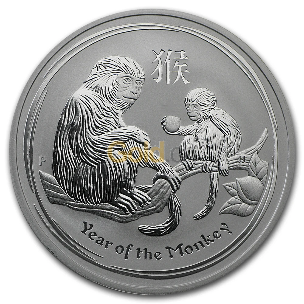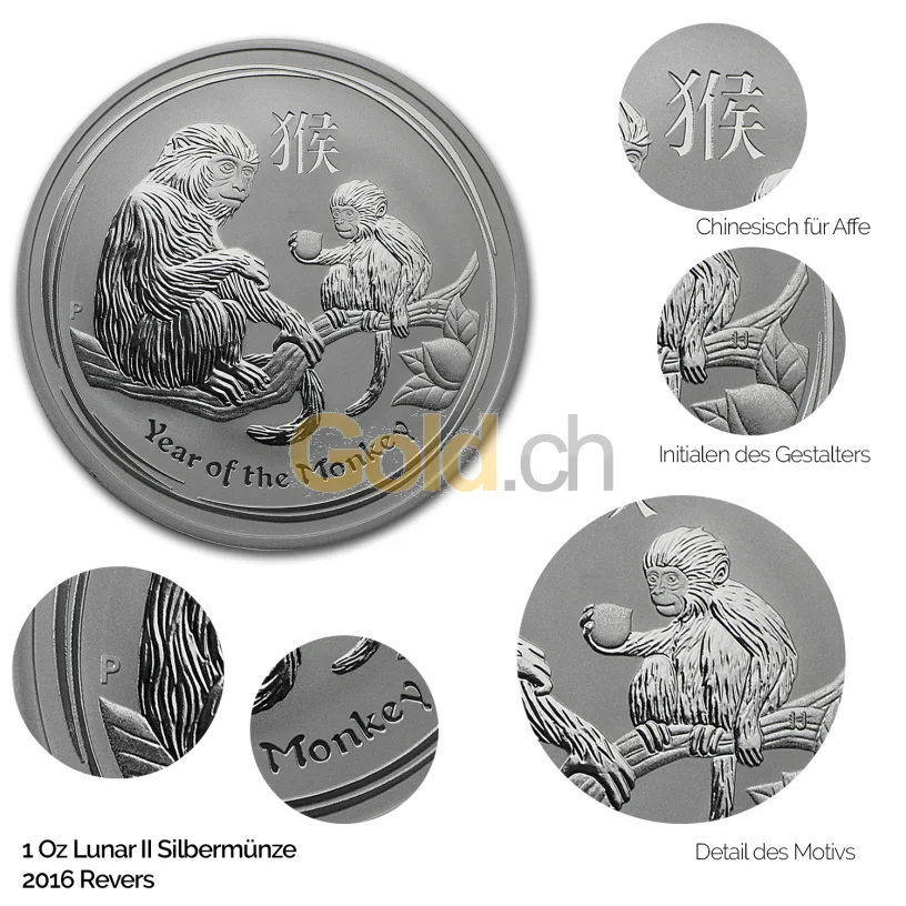 Die Perth Mint-Designerin Ing-Ing Jong entwarf auch das Bildseitenmotiv für die 2016er Münze. Ihre Initialen IJ sind im Baumstamm am rechten Münzrand zu finden. Dargestellt ist eine Affenmutter mit ihrem Jungtier, das eine Frucht in der rechten Hand hält. Beide Primaten sitzen auf dem Ast eines Pfirsichbaumes, der insbesondere durch die abgebildeten Früchte erkennbar ist. Das lange Fellkleid der Makaken-ähnlichen Tiere ist detailliert wiedergegeben. Prominent ist die Jahrgangsbeschriftung "Year of the Monkey" am Münzboden platziert, während sich das Prägezeichen P am linken Rand verbirgt. Am Kopf der Münze ist das China-Schriftzeichen für Affe zu lesen (hóu = wendig).