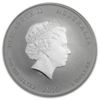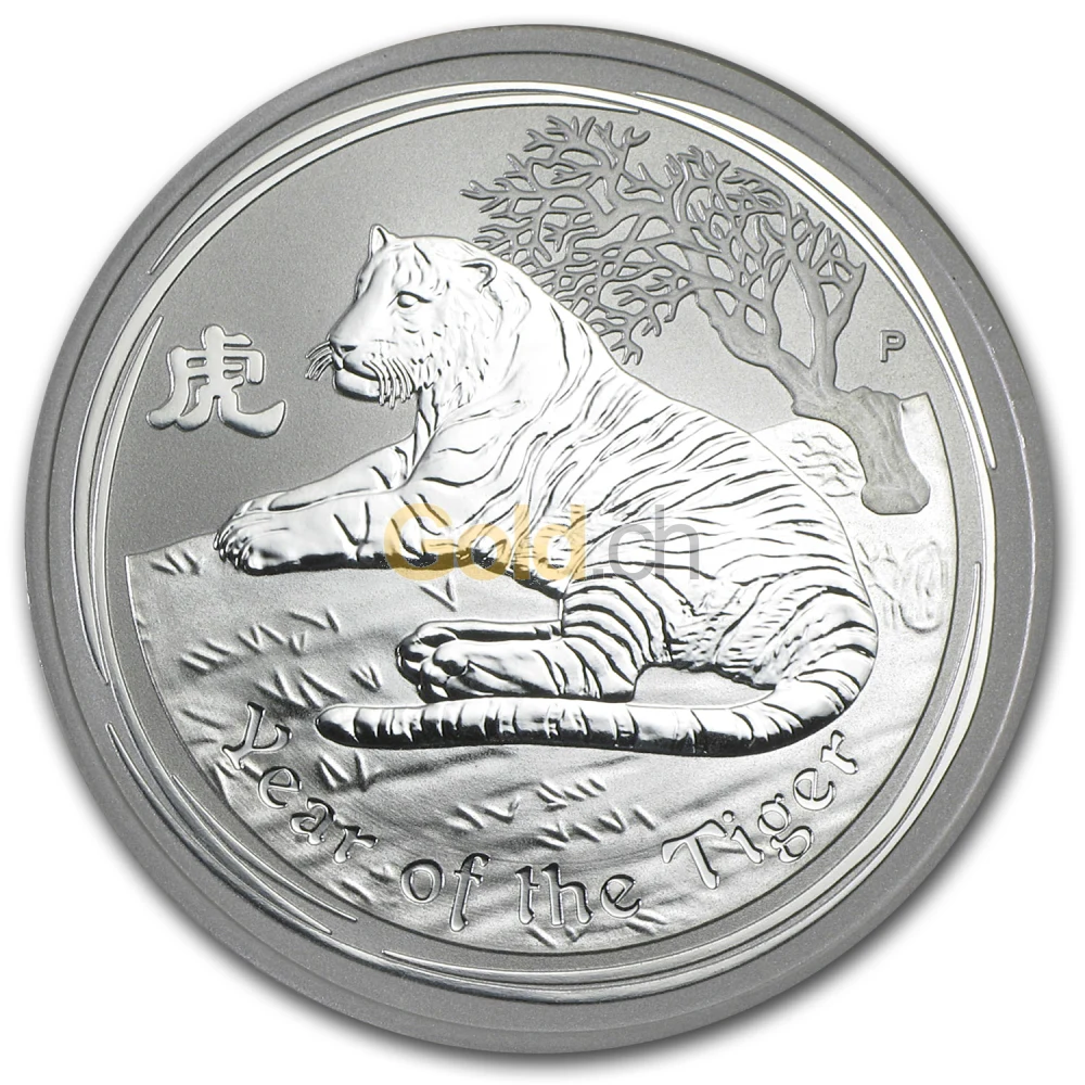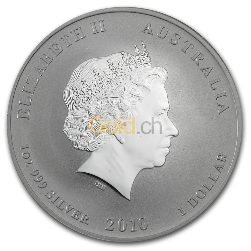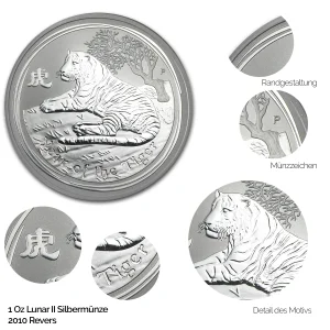 Die Lunar II Münze des Jahrgangs 2010 hat passend zum Himmelszeichen einen Tiger als Symbolträger. Die mächtige Raubkatze liegt bequem im Gras ausgestreckt, ein knorriger Baum befindet sich zu ihrer Rechten. Dort ist auch das Münzzeichen P integriert in einer eigens dafür geschaffenen Lücke. Dagegen hat die Umschrift "Year of the Tiger" Mühe, sich von dem unruhigen Hintergrund abzuheben. Neben dem Maul der Großkatze schwebt das Han-Zeichen für Tiger (hŭ = verwegen).