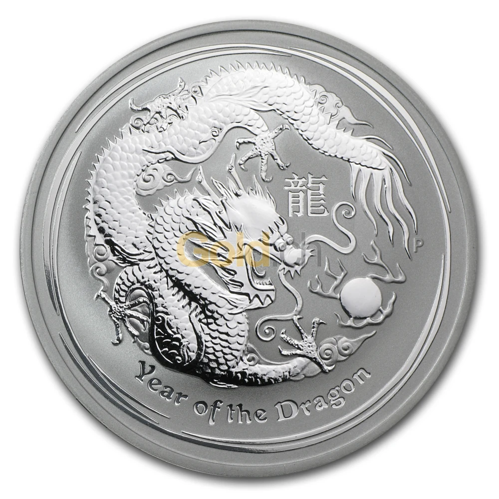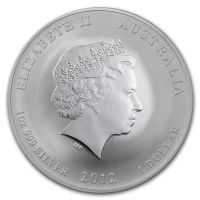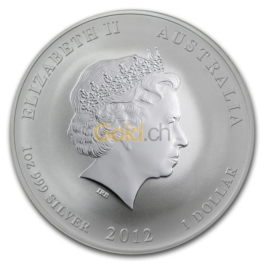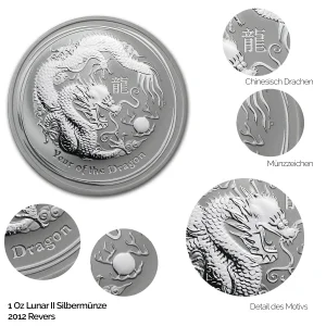 In das 2012er Motiv sollte sich der Betrachter eingehend vertiefen, denn es gibt viel zu sehen. Der schlangenartige Drachen Long bestimmt das Revers. Sein aufgerissenes Maul mit den beiden Nasenbärten ist genau im Zentrum des Geldstücks platziert, während sich sein Köper mit Schwanz, Klauen und Schuppen überall zu befinden scheint. Gierig stiert das Untier auf die Drachenperle – in der chinesischen Mythologie einziges Mittel, um es zu besänftigen. Freigestellt von der Szenerie erscheint die Bodenbeschriftung "Year of the Dragon". Auch für das Münzzeichen P wurde eine freie Stelle am rechten Rand genutzt. Dagegen ist das chinesische Wort für Drachen in das Motiv integriert (lóng = geistreich).
