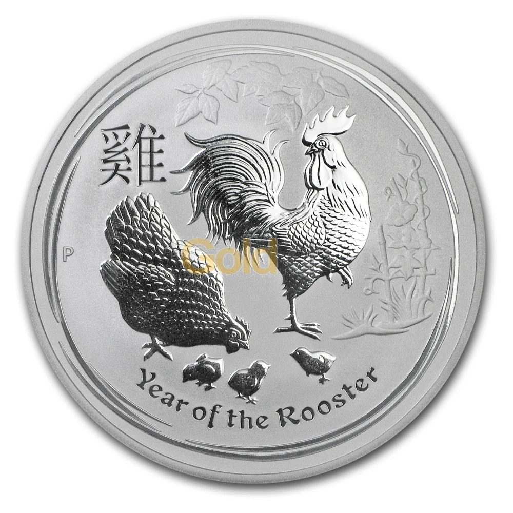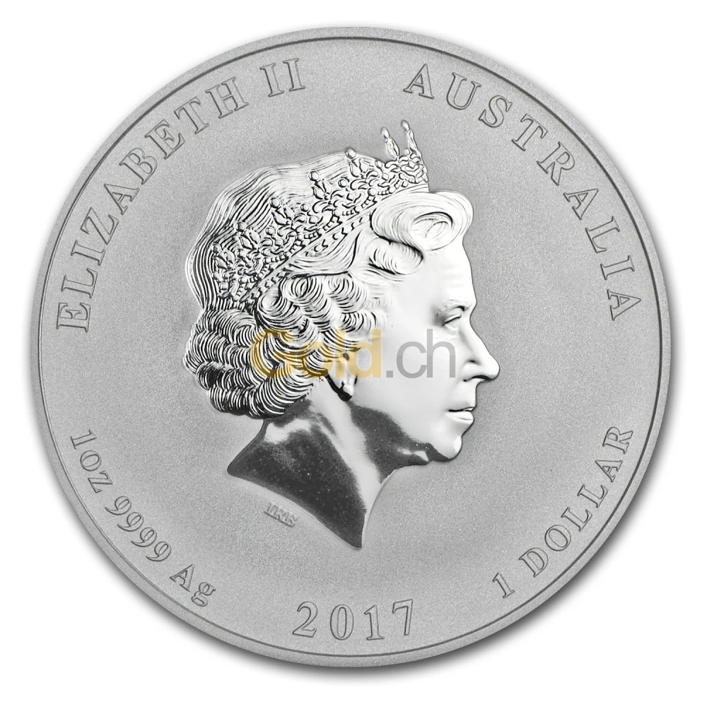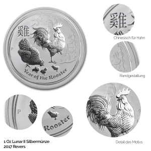 Mit viel Liebe zum Detail ist der Münzavers des Lunar Serie II Silbers aus 2017 gestaltet. Es präsentiert einen prächtigen Hahn, der auf einem Bein steht und über seine Familie wacht. Seine Henne beaufsichtigt den Nachwuchs, der neugierig den Boden untersucht. Auch bei diesem Motiv legte der Designer Wert darauf, die Tiere in ihrer natürlichen Umgebung darzustellen, wenngleich sich die Vegetation dezent im Hintergrund hält. Am linken Rand der Münze ist das Prägezeichen P platziert und am Boden die klassische Jahresbezeichnung, in diesem Fall "Year of the Rooster". Kenner der Han-Schrift erkennen das Symbol für Hahn oben links (jī = Kraft). Mit diesem Jahrgang wurde die Feinheit der Münze auf 999,9/1000 angehoben – erkennbar an der Umschrift "9999 Ag" auf dem Avers.