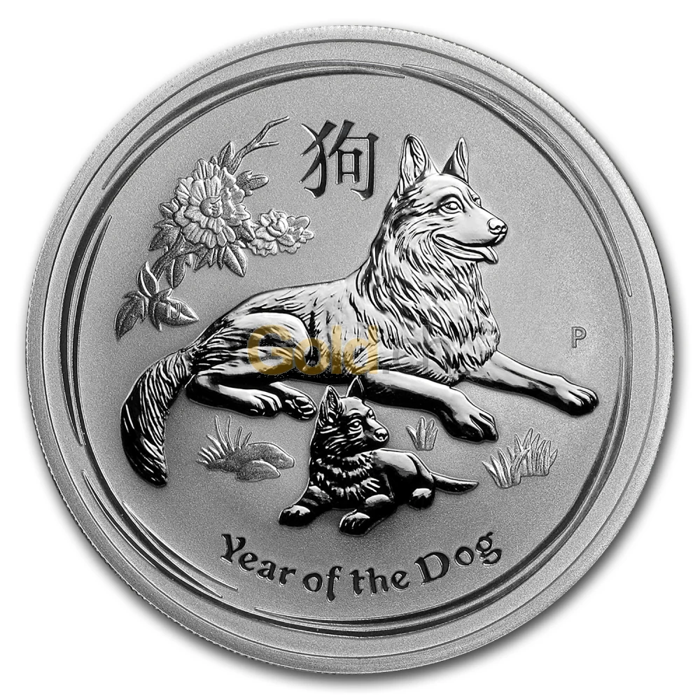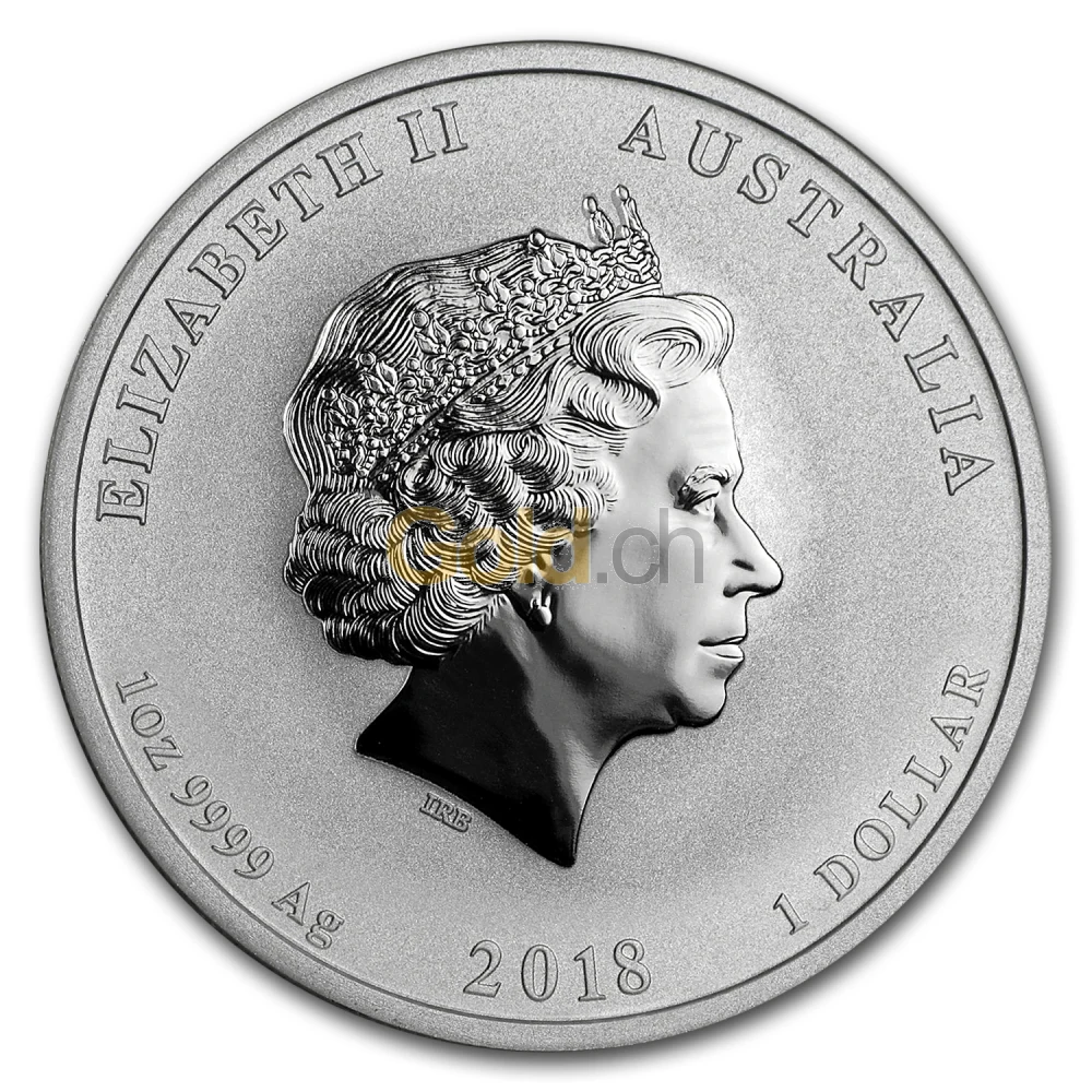 Das Silberstück des Jahrgangs 2018 zeigt auf seinem Revers eine ruhende Schäferhündin mit einem ihrer Jungtiere. Gräser und Äste im Umfeld deuten an, dass sich die Hunde draußen aufhalten. Die Abbildung besticht durch großen Detailreichtum, der sich in der feinen Fellzeichnung beider Tiere widerspiegelt. Entworfen wurde die Darstellung von der Coin-Designerin Ing-Ing Jong – zu erkennen an den Initialen IJ, die sich im Pflanzenblatt am linken Münzrand verbergen. Gegenüber ist das Münzzeichen P platziert und den Boden ziert die Beschriftung "Year of the Dog". Das China-Wort für Hund ist im Kopf des Revers zu finden (gŏu = treu).