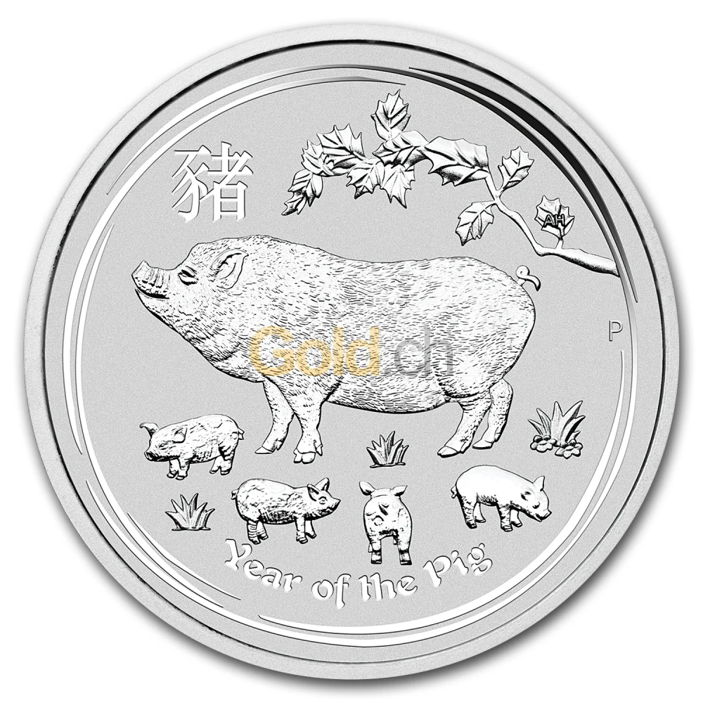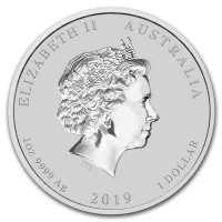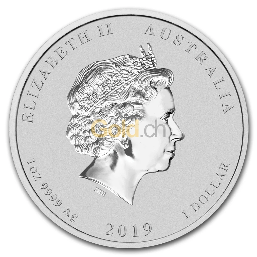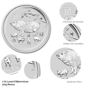 Mit der 2019er Ausgabe endet die 2. Serie der Lunar Silbermünze. Ihre Rückseite stellt eine Sau mit vier Ferkeln dar, die im Vordergrund spielen. Als Symbol für Glück und Gesundheit trägt das Lunar II Schwein den Rüssel nach oben. Grasbüschel deuten Freiland an und von rechts ragt ein Baum in die Szenerie. Versteckt auf dem ersten Blatt am rechten Münzrand sind die Initialen des Gestalters AH zu finden, welche für die Perth Mint-Designerin Aleysha Howarth stehen. Darunter ist das Münzzeichen P positioniert und am Münzboden die rund gesetzte Schrift "Year of the Pig". Am linken oberen Rand des Lunar II 2019 Schweins ist zudem das Han-Wort für Schwein platziert (zhū = ehrlich).