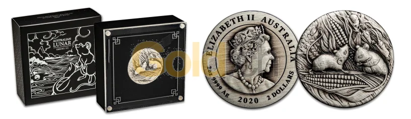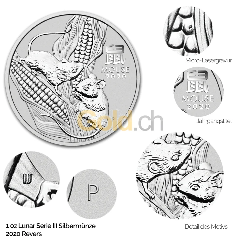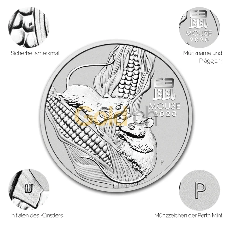 Gleich zwei Mäuse tummeln sich auf der Bildseite der ersten Serienausgabe. Sie balancieren auf einem Maisstängel. Deutlich treten die reifen Feldfrüchte hervor, von denen sich bereits die Blätter lösen. Das stellt ein gefundenes Fressen für die beiden possierlichen Nagetiere dar, die sich durch eine detaillierte Zeichnung von Fell, Krallen und Augenpartie ins Auge des Betrachters schmeicheln. Der englische Münzname »MOUSE« erscheint ebenfalls als chinesisches Schriftzeichen »shü», das auch »verwegen« bedeutet. Gestaltet hat das Motiv die australische Künstlerin Ing Ing Jong, erkennbar an ihren Initialen am linken Außenrand. Erstmals kommt bei den Lunar-Silbermünzen ein neues Sicherheitsmerkmal zum Einsatz: Im oberen Maiskolben ist eine Micro-Lasergravur platziert, die nur mit der Lupe zweifelsfrei erkennbar ist.