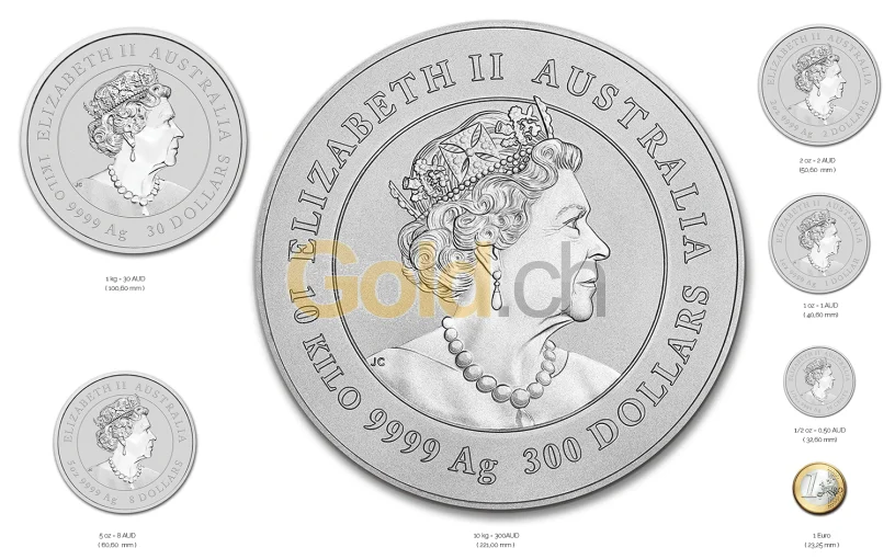 Die Stückelungen von 1/2 oz bis 10 kg im Größenvergleich zu 1 Euro