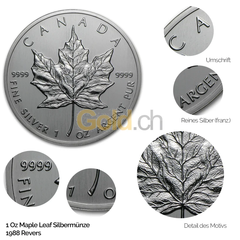 Die Silbermünze Maple Leaf gehört weltweit zu den beliebtesten und auflagenstärksten Anlageprodukten, das gleichermaßen von Sammlern geschätzt ist. Sie wird seit 1988 von der kanadischen Münzprägestätte Royal Canadian Mint herausgegeben. Mit dem gleichbleibenden Bildseitenmotiv, das ein einzelnes Zuckerahornblatt zeigt, besitzt sie einen hohen Wiedererkennungswert. Produziert wird der Silber Maple Leaf mit einem hohen Feingehalt von 999,9/1000 und markiert damit die erste Bullionmünze der Welt, die aus reinem Silber besteht. Neben dem China Panda (1983) und dem American Eagle (1986) zählt sie zu den ältesten Silbermünzen, die für den Anlagemarkt produziert werden.