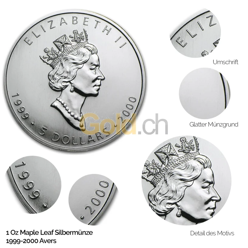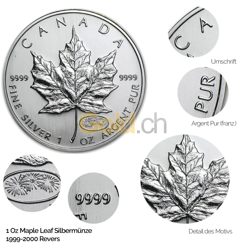 Mit einem stilisierten Feuerwerk lässt der 2000er Maple Leaf das neue Jahrtausend hochleben. Den Revers ziert ein zusätzlicher Miniaturstempel mit drei Rosetten. Auch der Avers nimmt Bezug zum Millennium. Die Umschrift am Münzboden lautet: »1999 ◦ 5 DOLLARS ◦ 2000«.