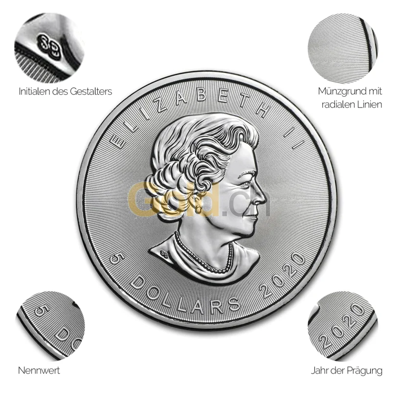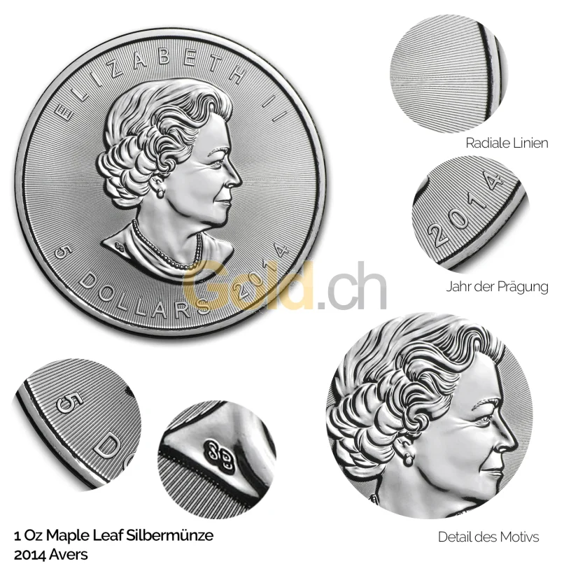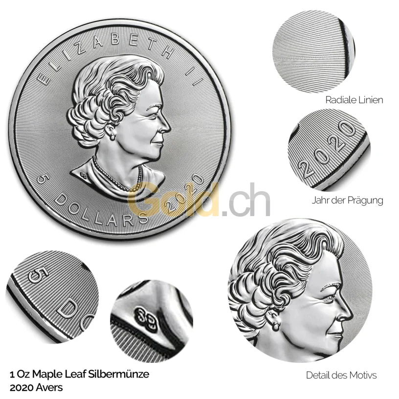 Die Silbermünze Maple Leaf entsteht seit dem Erstprägejahr 1988 mit den gleichen Motiven. Während die Bullionmünze in Prägequalität Stempelglanz erscheint, glänzen die Sonderausgaben mit unterschiedlichen Veredelungen um die Wette (mehr dazu im Abschnitt »Sonderprägungen«). Um die Einzigartigkeit der Münze zu unterstreichen und sie vor Fälschungen zu bewahren, erscheint sie seit 2014 mit einem beidseitigen Münzgrund aus radialen Linien, die durch ein aufwendiges Gravurverfahren auf die Ronden gebracht werden. Auf diese Weise entsteht ein hochfeines Muster im Mikrometer-Bereich, das für faszinierende Lichteffekte sorgt.