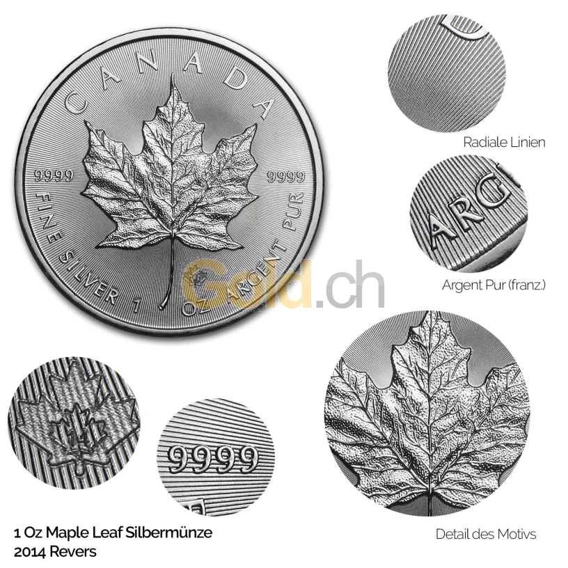 Erstmals 2014 präsentiert sich die kanadische Silbermünze im neuen Design. Statt des bisher glatten Münzgrundes verzieren nun hochfeine radiale Linien beide Münzseiten. Die elegante Lasergravur stellt ein Alleinstellungsmerkmal her und sorgt für Fälschungssicherheit. Dazu trägt ebenfalls das neue Privy-Mark bei: Ein zweites, winziges Ahornblatt inklusive fortlaufender Jahreszahl ziert ab sofort den Revers.