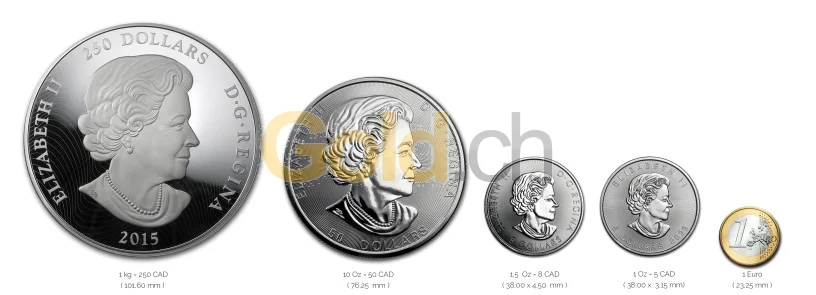 Größenvergleich Maple Leaf Silbermünze mit 1 Euro-Stück