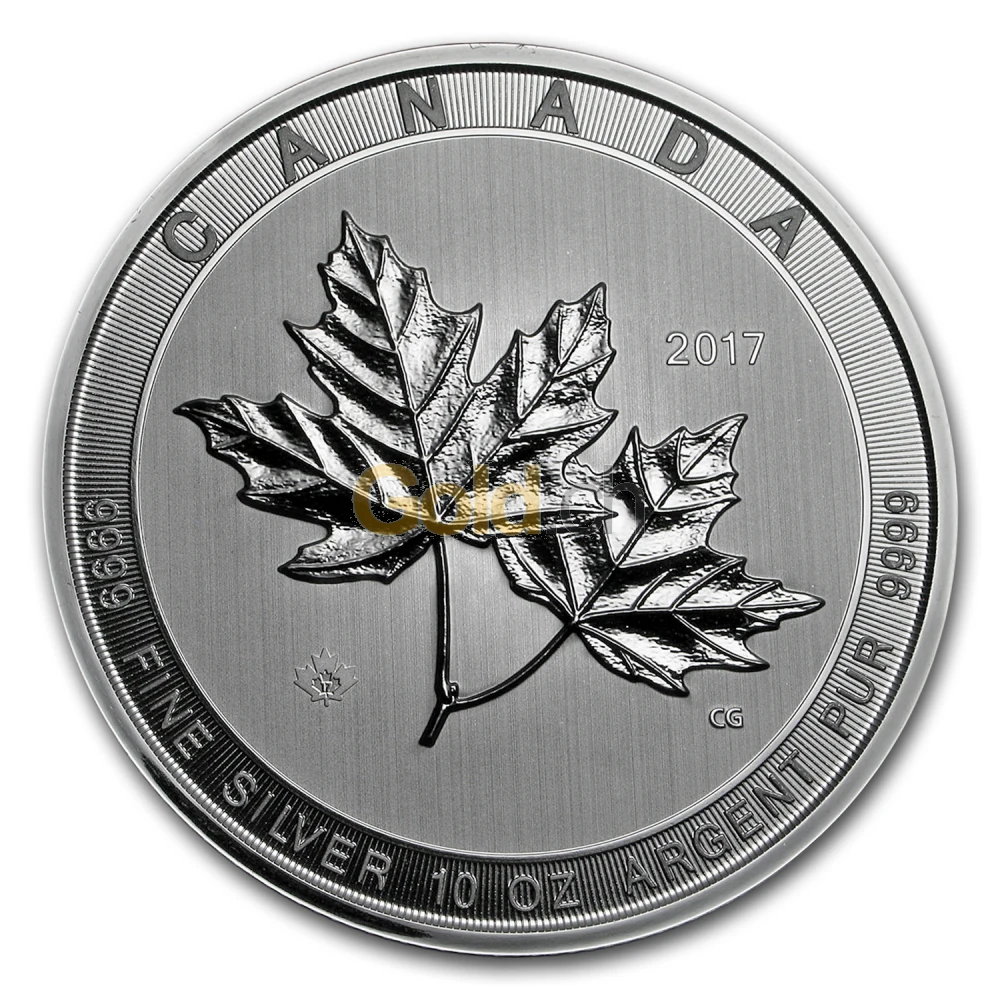 Seit 2017 erscheint zudem die 10 Unzen-Ausgabe »Magnificent Leaf« mit einem Nennwert von 50 CAD in Prägequalität Stempelglanz. Die 76,25 Millimeter durchmessende und 311 Gramm schwere Silbermünze zeigt auf der Vorderseite das bekannte Radialdesign, während dies auf dem Revers nur im Außenring erscheint. Der übrige Münzgrund der Bildseite ist glatt gehalten. Sie zeigt ein doppeltes Ahornblatt nach einem Entwurf der kanadischen Gestalterin Celia Godkin (Initialen CG).