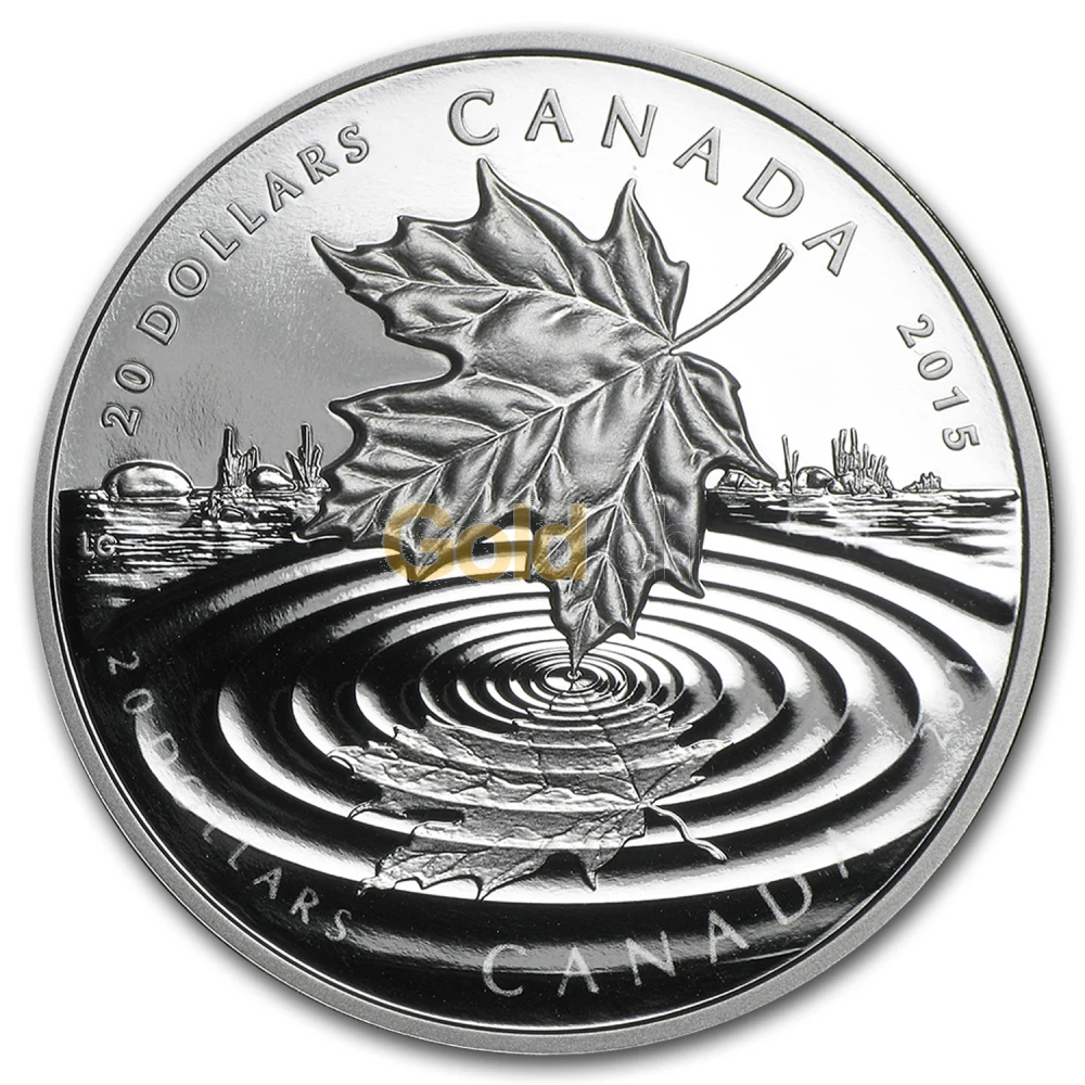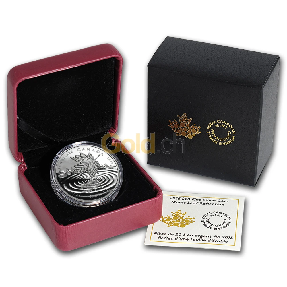 Auch die Edition »Maple Leaf Reflection« erfreut Sammlerherzen. Ihr Motiv zeigt ein Ahornblatt, dass sich im Wasser spiegelt und Wellenlinien auslöst. Die Ausgabe erschien ebenfalls 2015 in Prägequalität Polierte Platte und besitzt einen Nennwert von 20 CAD bei einer Feinunze Silber.