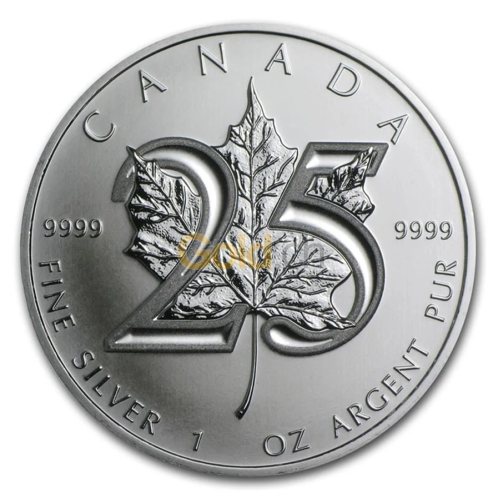 Der Silber Maple Leaf erscheint 2013 gleich mit zwei unterschiedlichen Gestaltungen. Ein Teil der Auflage würdigt auf der Rückseite das 25. Prägejubiläum der Silbermünze. Kenntlich gemacht wird dies durch die überdimensionale 25, die auf den Zacken des Ahornblatts aufgehängt ist.