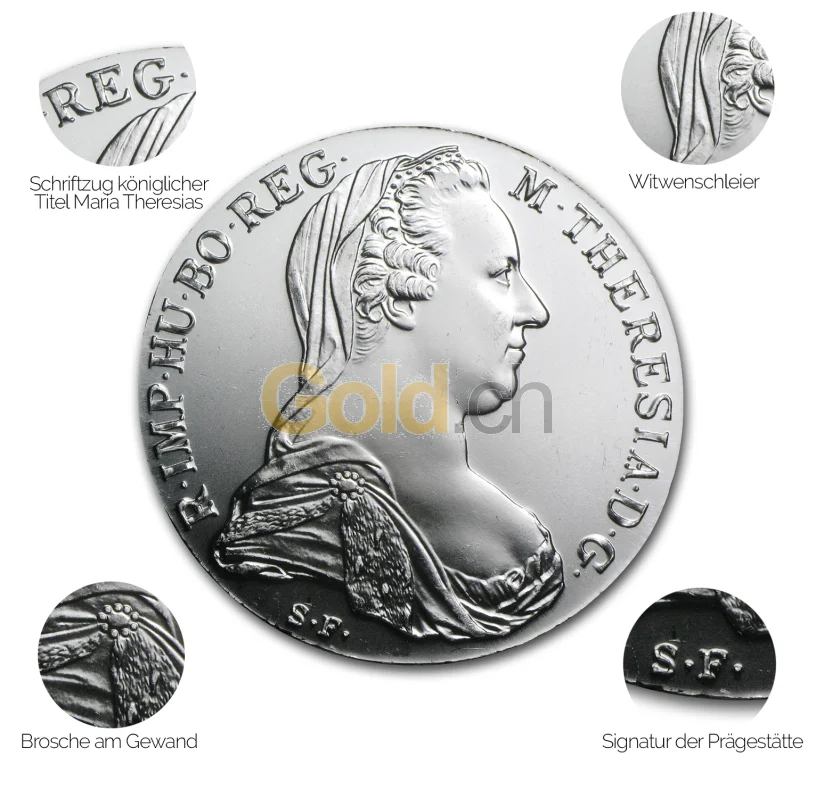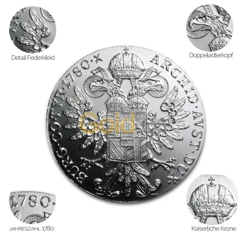 Die Silbermünze „Maria Theresien Taler“ zeigt auf der Vorderseite das Bild der Witwe Maria Theresia. Die Rückseite des Talers aus Österreich stellt das Wappen des römisch-deutschen Kaiserreichs aus dem Jahre 1780 vor. Der Münzgrund auf beiden Münzseiten ist glatt.