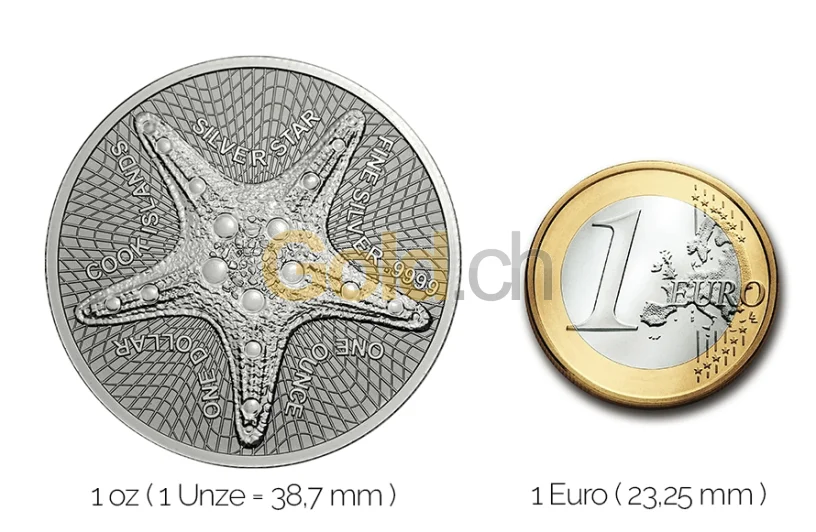 Größenvergleich Silver Star Silbermünze mit 1 Euro-Stück