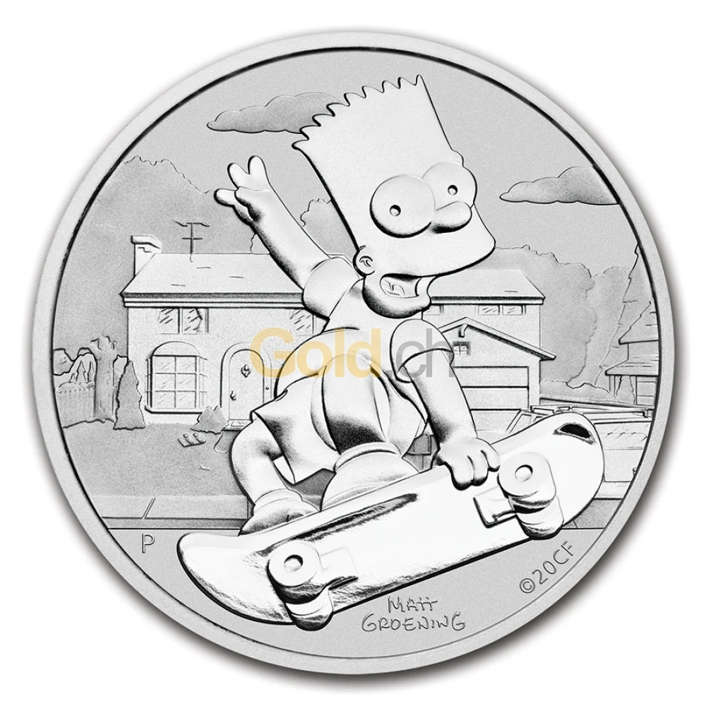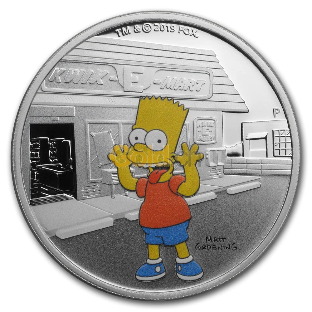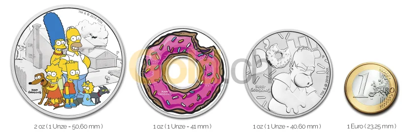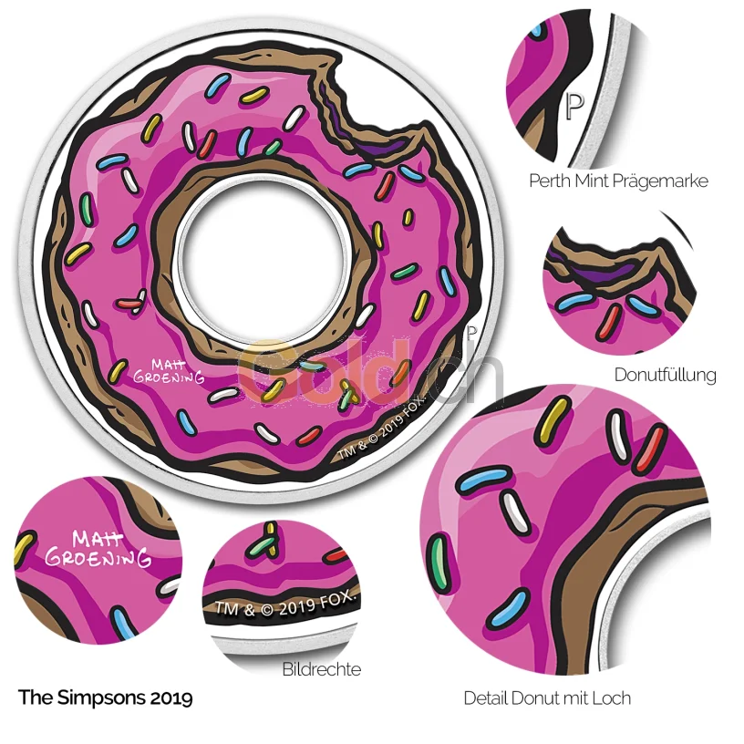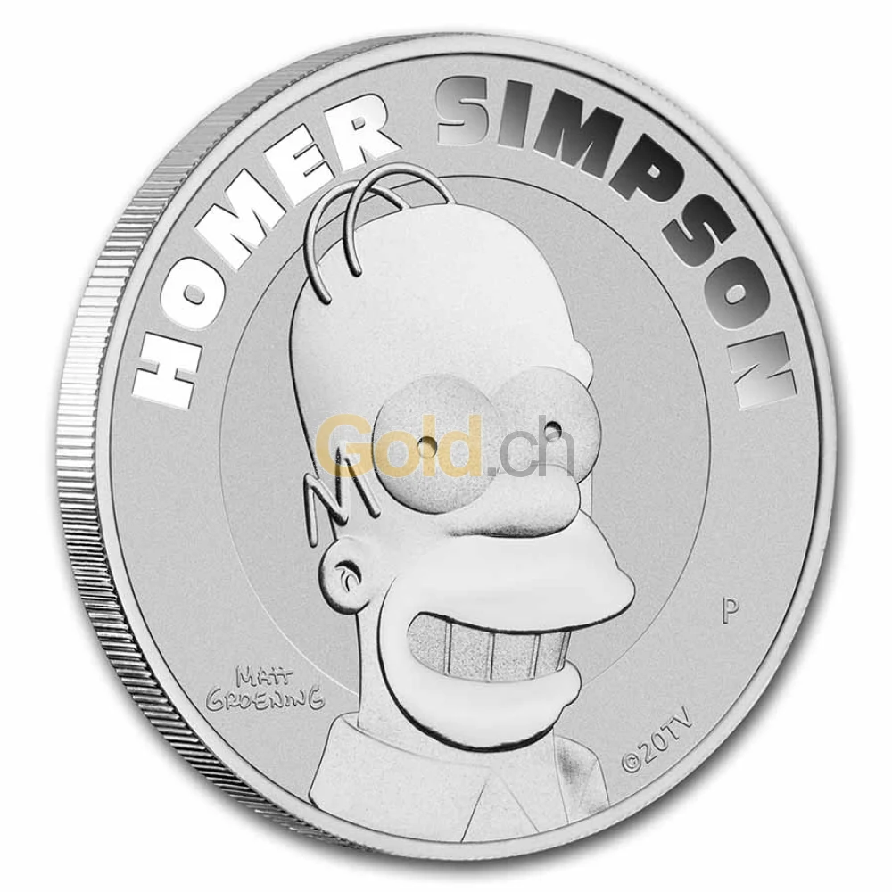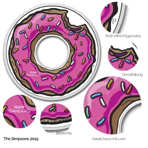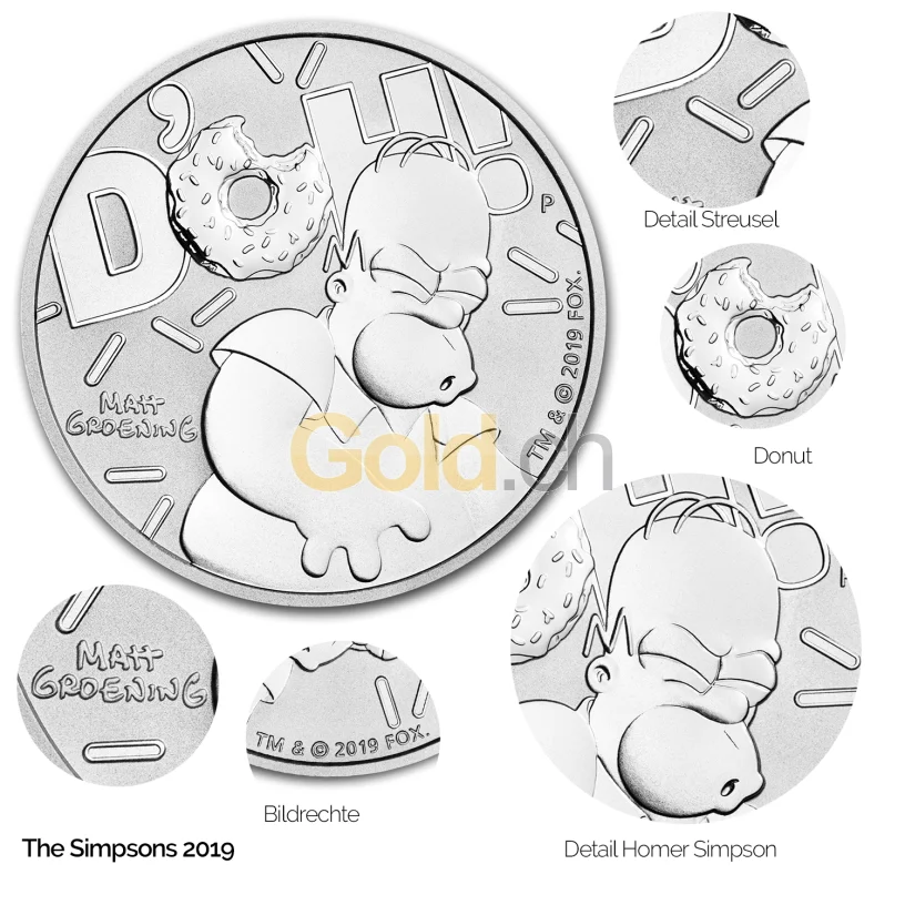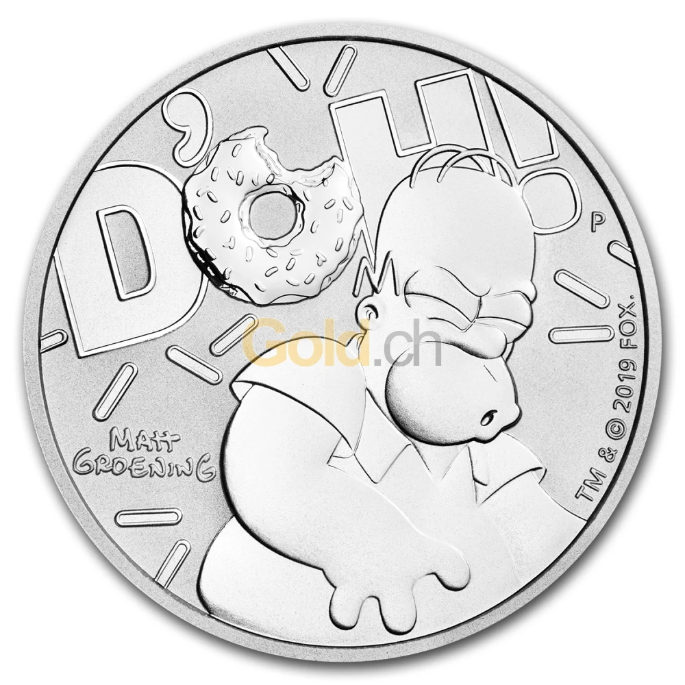 Die erste Silbermünze aus der Serie „The Simpsons“ erscheint erstmalig im Jahre 2019. Die Prägeanstalt Australian Perth Mint ließ die bekannte Geste des Hauptcharakters Homer Simpson auf die erste Silbermünze aus der Serie prägen. Homer Simpsons ruft sein Catchphrase (Schlagwort) aus: „D'OH“ was im Deutschen mit „NEIN“ übersetzt wird. Dazu zuckt er in typischer Haltung zusammen, während über ihm sein Ausruf in breiten Buchstaben erscheint, wobei das O durch einen angebissenen Donut ersetzt wurde. Auf dem matten Hintergrund der Münze befinden sich Zuckerstreusel eines Donuts. Links neben Homer ist die Unterschrift von Matt Groening zu lesen. Diese Silbermünze ist auf 25.000 Stück limitiert.