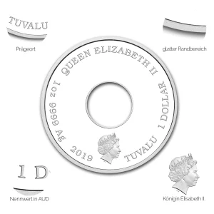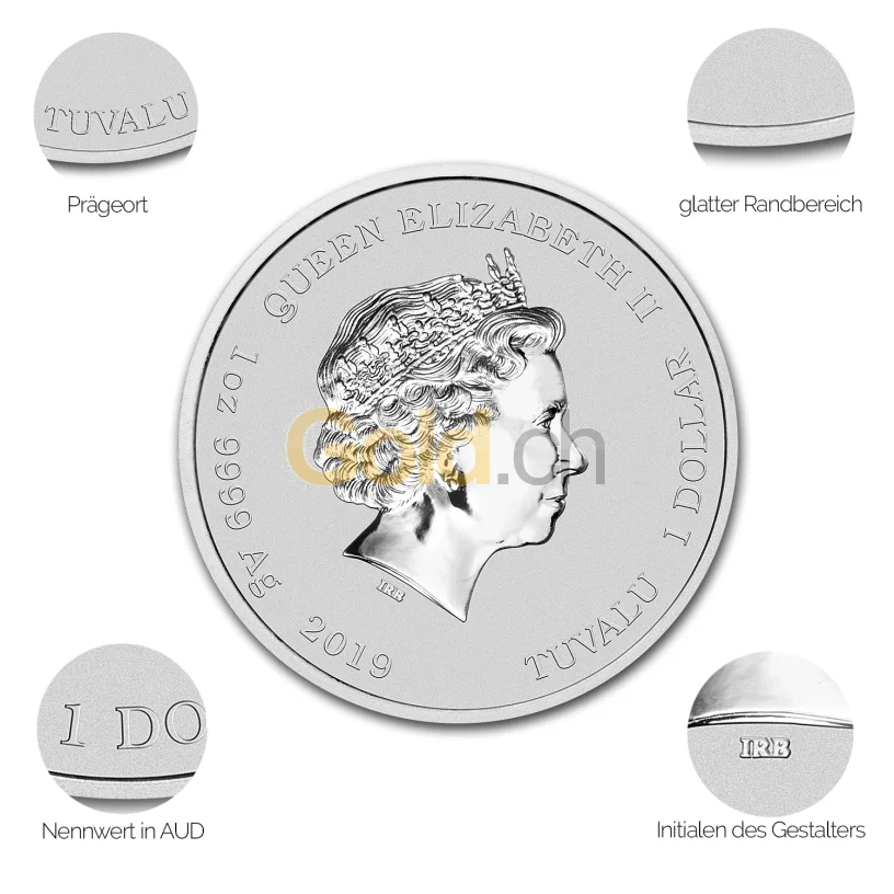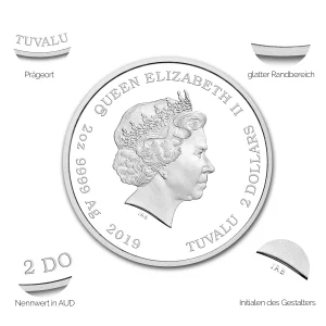 Die Vorderseite ist bei jeder Silbermünze mit dem Porträt der Königin des Commonwealth versehen: Elisabeth II. Um sie herum verlaufen die Schriftzüge „ELIZABETH II“, „TUVALU“ und „1 DOLLAR“. Von dem glänzenden Hintergrund des Motivs hebt sich die matte Schrift (mit Serifen) leicht ab.