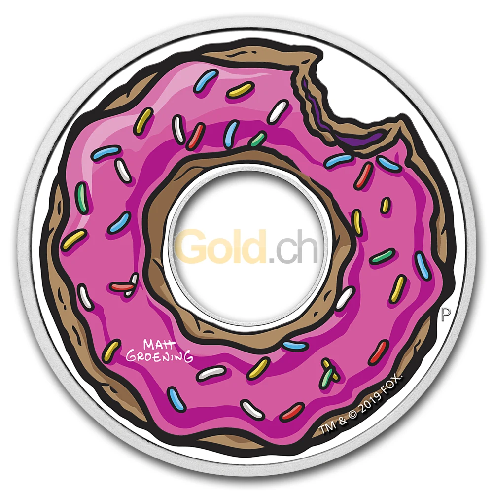 Mit der zweiten Silbermünze aus der Serie „The Simpsons“ ändert sich das Motiv zu einem Donut, der als kolorierter Ring auf der Münze erscheint. Auch das Loch im Donut fehlt im inneren der Münze. So wirkt das Gebäck mit der pinken Glasur und den bunten Streuseln wie das Original aus der TV-Serie. Sogar ein Biss ist am oberen Teil des Donuts zu sehen und verrät die Blaubeerfüllung des Rings. Um des Lochs Willen musste das Porträt der Königin auf einen Bruchteil ihrer ursprünglichen Größe schrumpfen. Sie erscheint als Miniatur auf der anderen Seite am unteren Rand des Rings. Dieses Exemplar ist auf nur 3.000 Stück begrenzt.