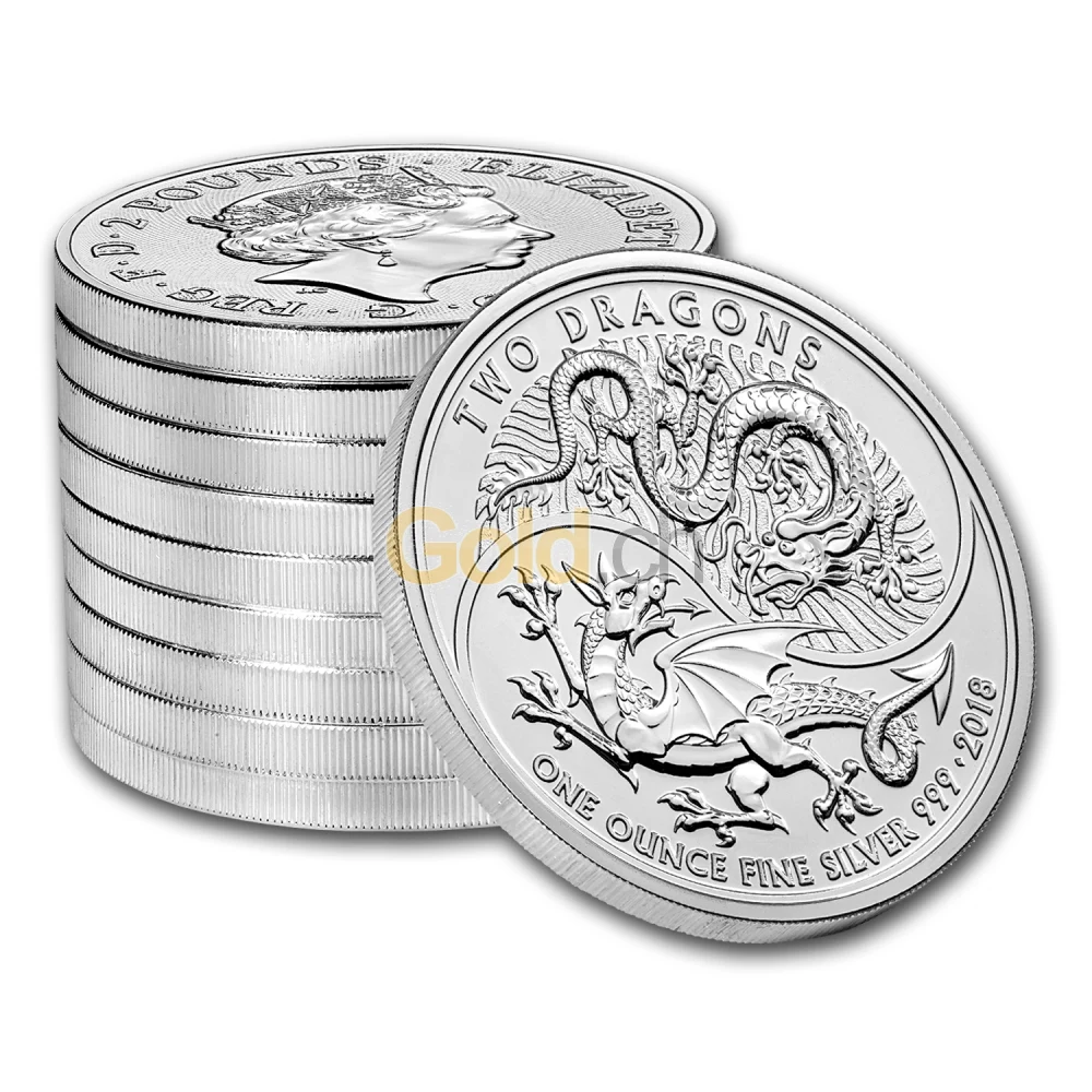 Mit der Silbermünze „Two Dragons“ (zwei Drachen) aus dem Jahre 2018 vereint die Prägeanstalt The Royal Mint zwei Motive aus den westlichen und fernöstlichen Kulturkreisen in Einem. Die Silbermünze zeigt eine Vereinigung des Drachen aus Wales und dem chinesischen Drachen in einem hochwertig geprägten Motiv. Der Feingehalt der Münze liegt bei 999.9 feinem Silber und ist mit der Stückelung von 1 oz auf 50.000 Stück begrenzt.