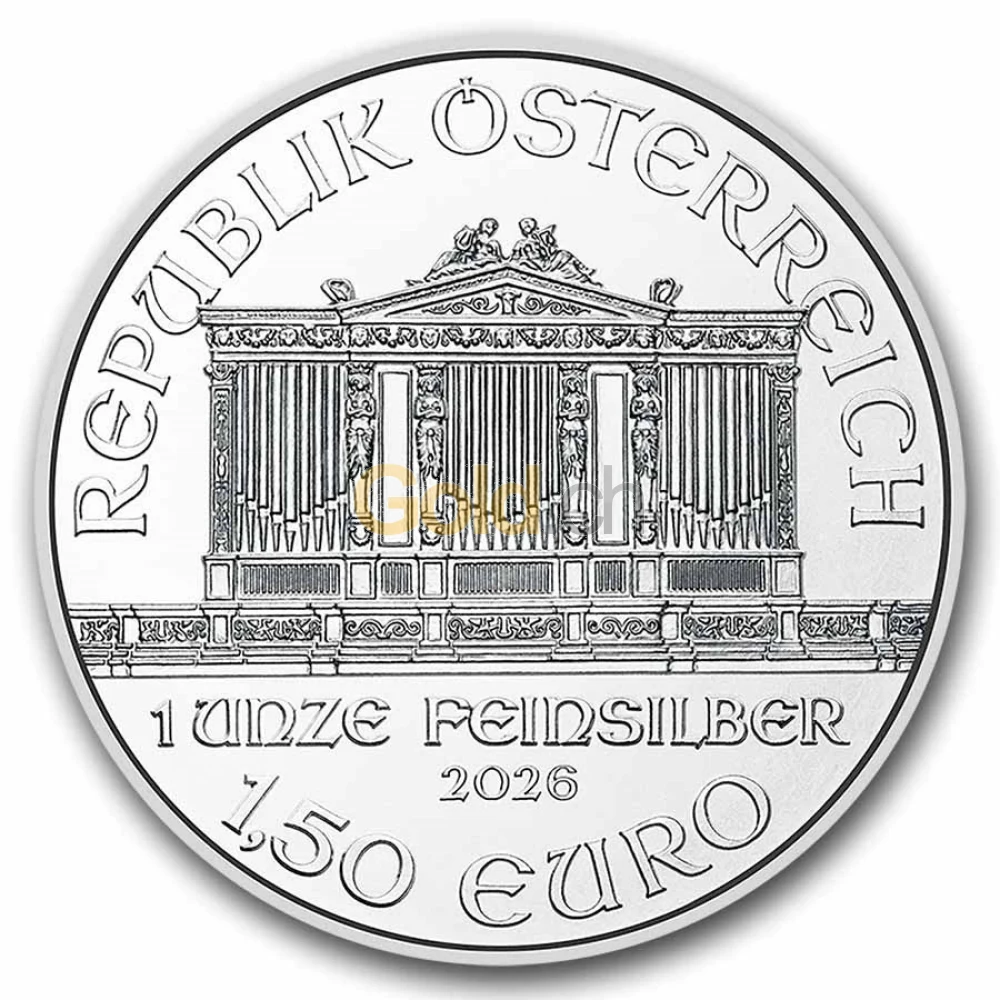 Die imposante Orgel des Orchesters ist ein Blickfang der Münze „Wiener Philharmoniker“. Ihr minutiöser Aufbau spiegelt sich in der detailgetreuen Darstellung wieder. Die Orgel, aus dem Jahre 1907, befindet sich im Goldenen Saal des Wiener Musikvereins, wo alljährlich ein Neujahrskonzert der Wiener Philharmoniker stattfindet. Im unteren Drittel der Münze steht ein waagerechter Schriftzug mit Stückelung, Feingehalt des Edelmetalls und Jahreszahl zu. Am unteren Rand verläuft der Nennwert der Münze: Bei 1 Unze sind es 1,50 Euro.